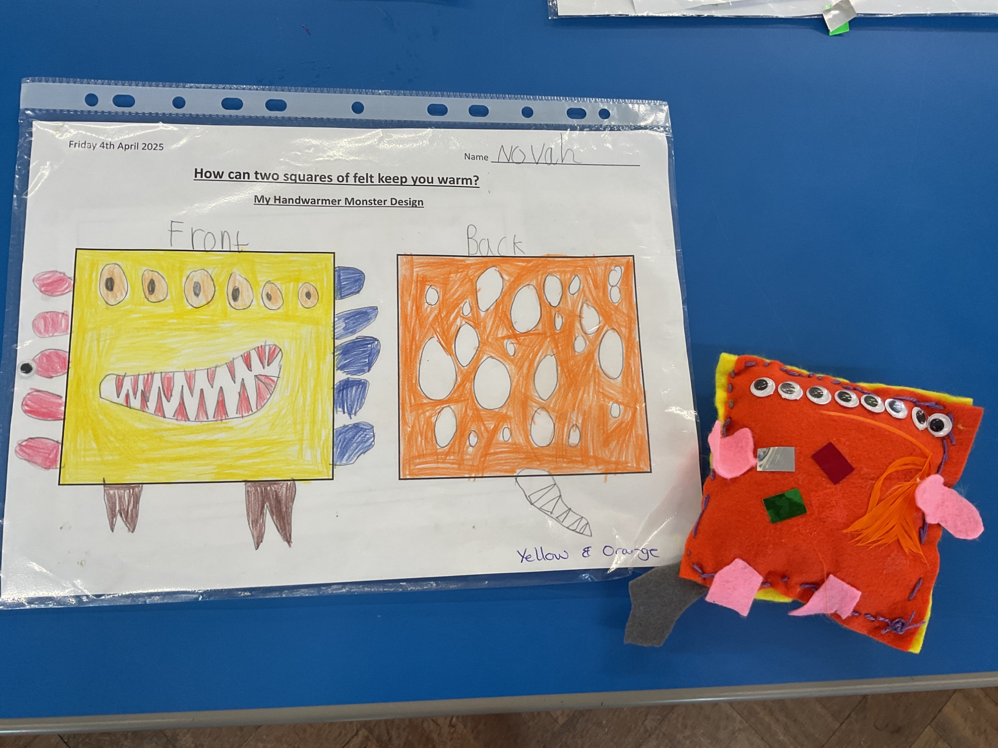 - Design, make and evaluate a Monster handwarmer using felt, collage materials and running stitch.